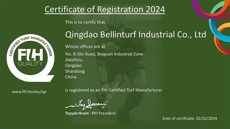 FIH Certified Manufacturerとはホッケー用人工芝の製造を専門とする会社です。このような会社はホッケーの試合で要求された基準に従って人工芝を作る能力があり、品質管理システムを運用して製品の一貫性を確保することができ、当該会社の製品を購入したお客様に全面的なメンテナンスアドバイスを提供することができるとFIHによって認定されております。